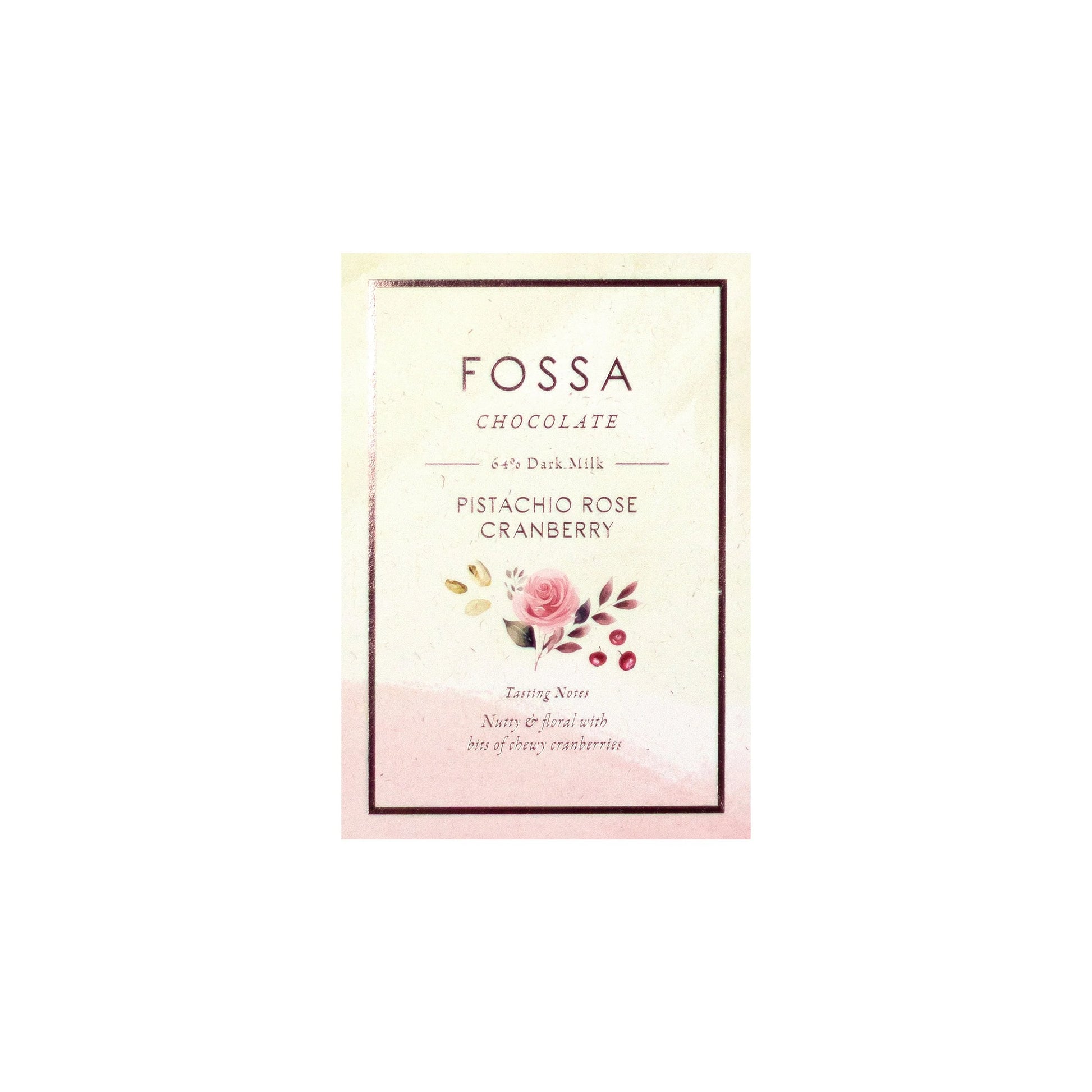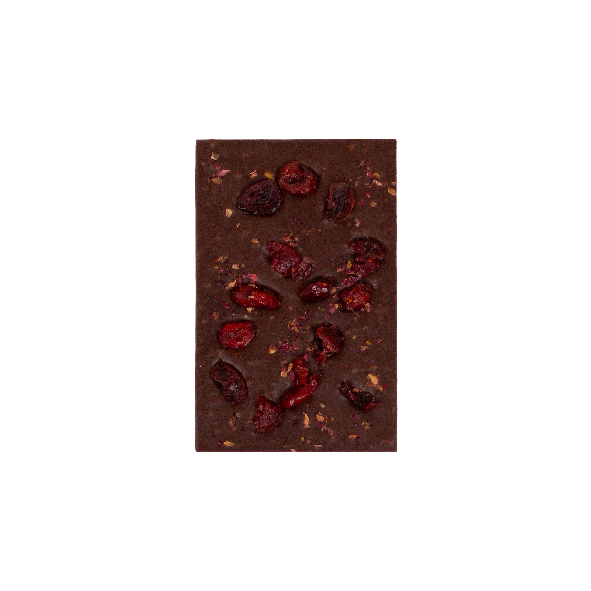 Ingredients: Cacao, cane sugar, cocoa butter, milk powder, pistachio, dehydrated cranberry, rose petal, rose absolute